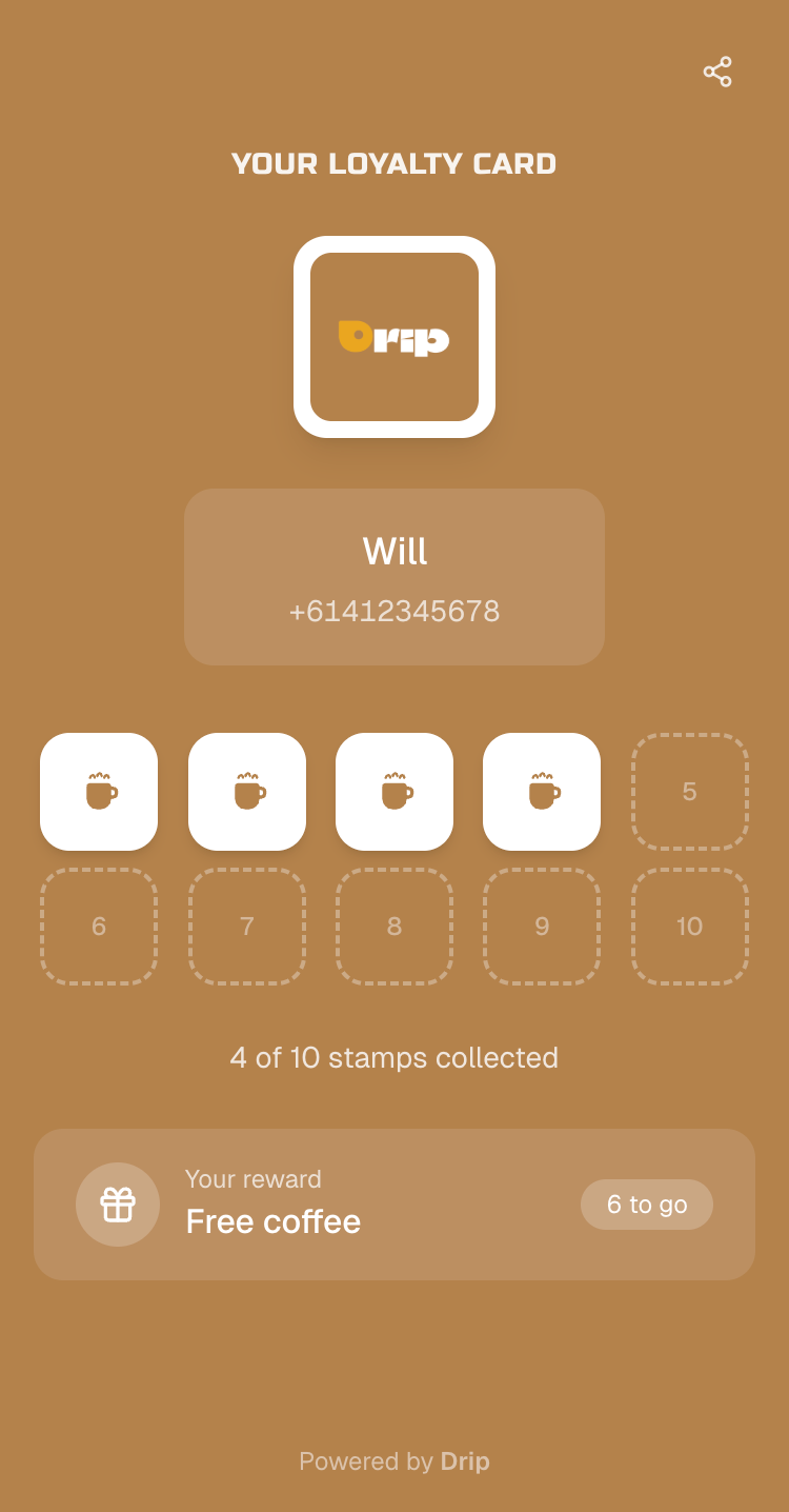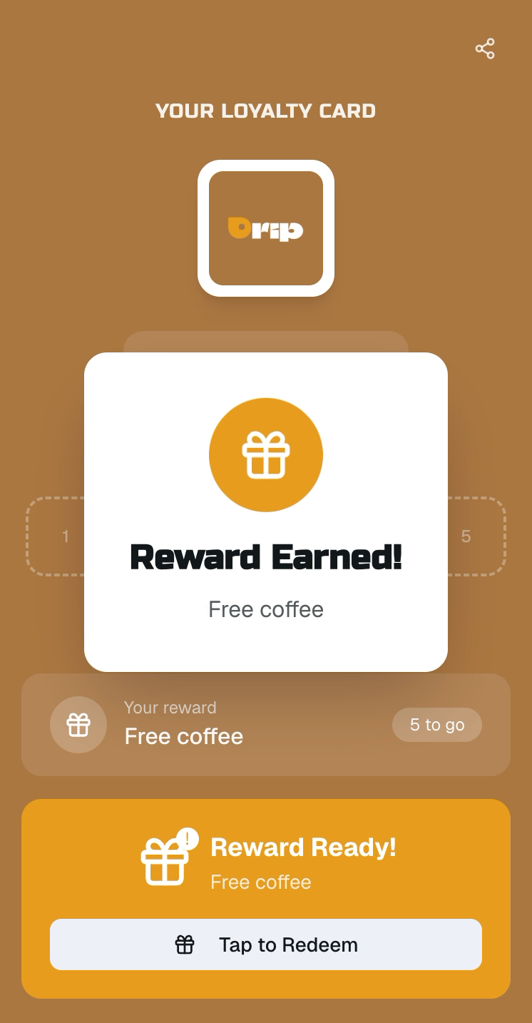Looks just like your current stamp card — but lives on your customer's phone and updates instantly